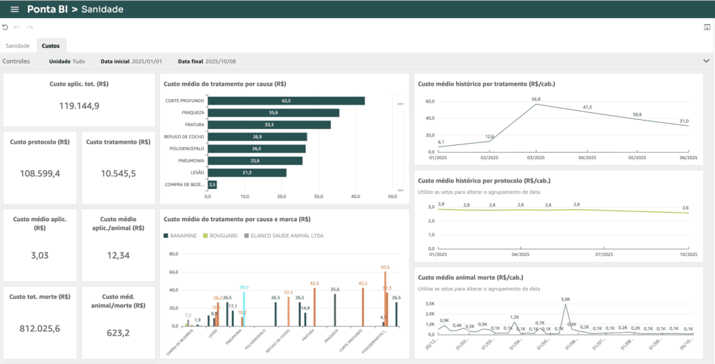 E para equipes que preferem acessar essas informações de forma mais visual e intuitiva, com painéis de gestão à vista, a Ponta oferece a integração do TGC ao Ponta Intelligence , um BI completo para pecuária de corte, incluindo manejo sanitário.